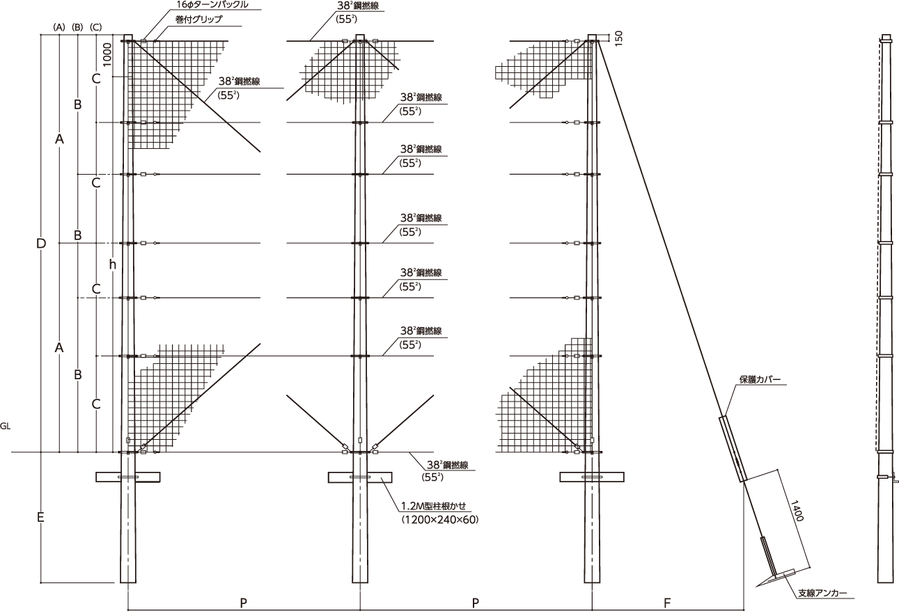 網止めワイヤー間隔 (A.B.C) | 2,500 | 3,000 | 2,300 | 2,600 | 3,000 | 2,500 | 2,950 | 3,125 | 3,375 |